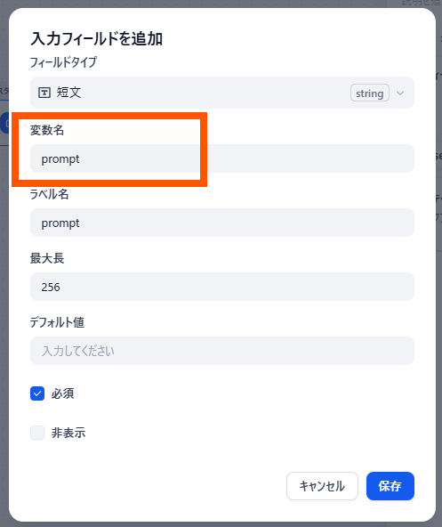 ※ 変数名は、後述のコードを合わせる必要があるので prompt としてください。