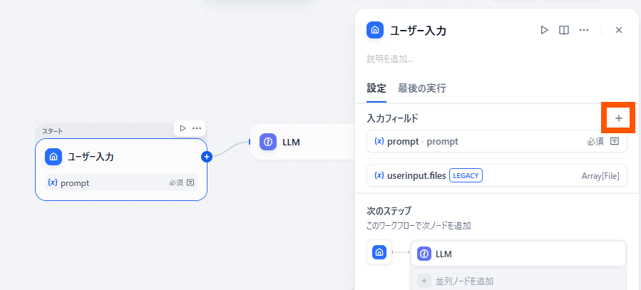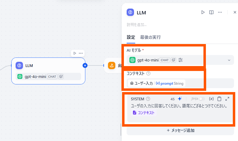 ※ 赤のマーカーのところがワークフローの入力で指定した prompt という変数名