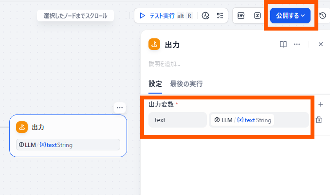 ※ 青のマーカーのところがワークフローの出力で指定した text という変数名