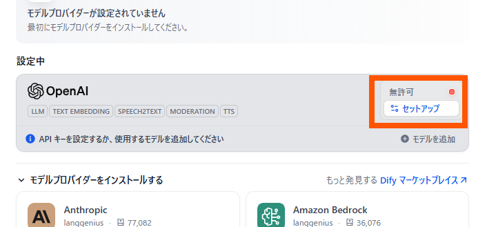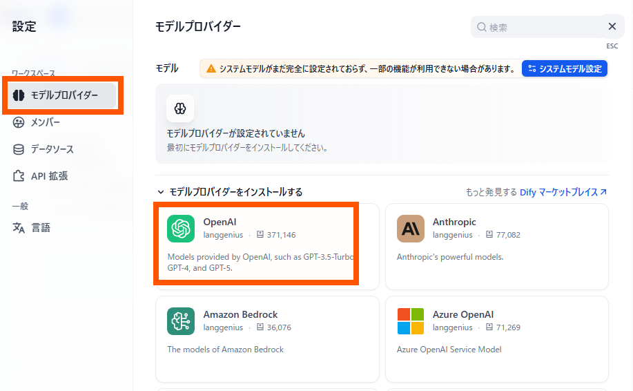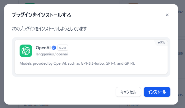 - モデルプロバイダーもプラグインになっているので、利用するものを選択してインストールする