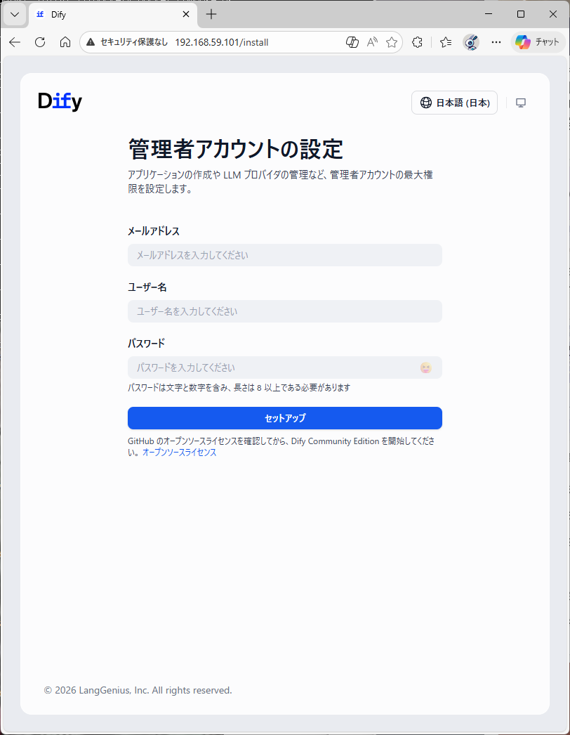初回アクセス時にオーナーのユーザとパスワードを設定します